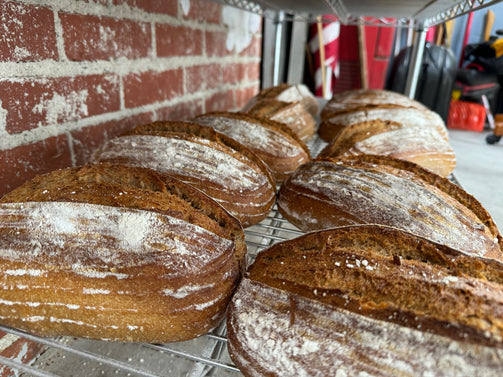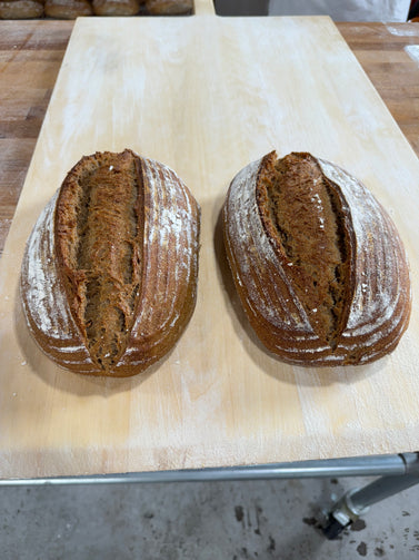 Organic 100% whole wheat flour, Organic wheat flour (organic malted barley flour), water, sea salt. This loaf is 100% sourdough and does not include commercial yeast